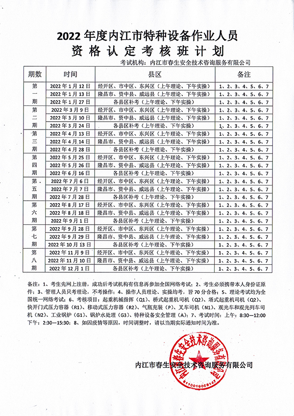 2022年春生公司05期特種設備作業(yè)人員考核時間安排