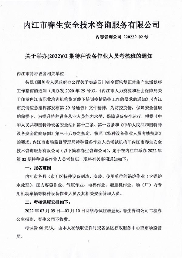 2022年春生公司02期特種設(shè)備作業(yè)人員考核時間安排