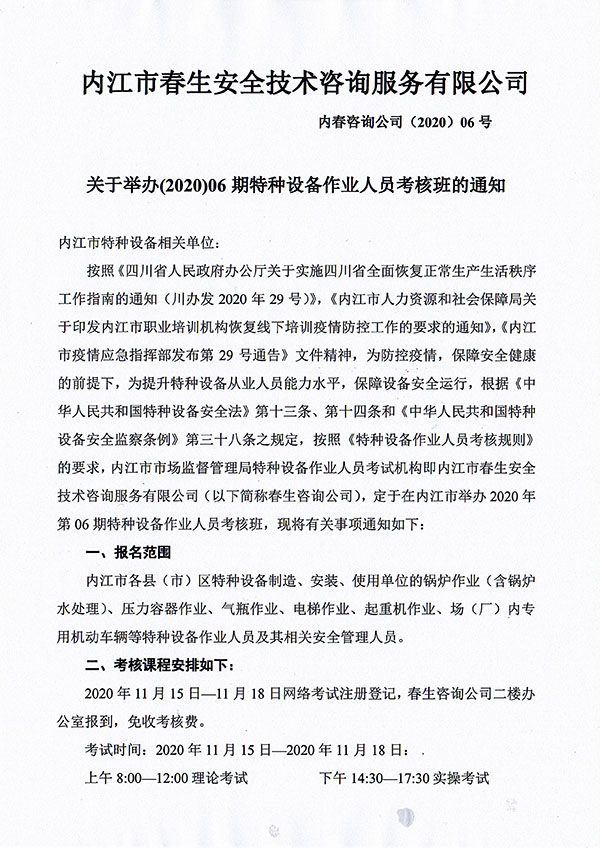 2020年春生公司06期特種設(shè)備作業(yè)人員考核班通知