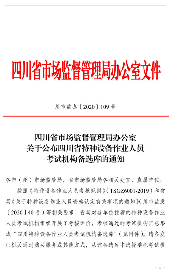 關(guān)于公布四川省特種設(shè)備作業(yè)人員考試機(jī)構(gòu)備選庫的通知